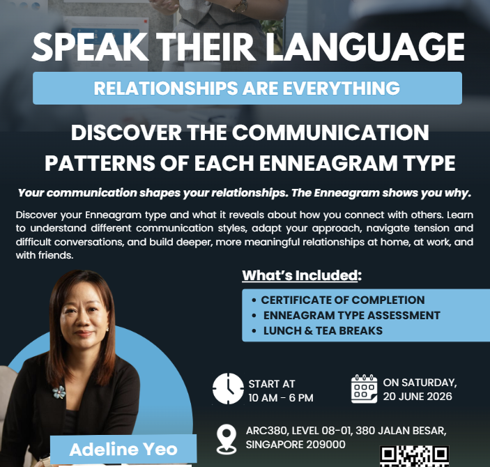 This full-day experience, led by Adeline Yeo, Founder of the Ministry of Public Speaking, combines Enneagram insights with honest reflection and real conversation — so the shifts you make aren’t just intellectual. They’re felt.
